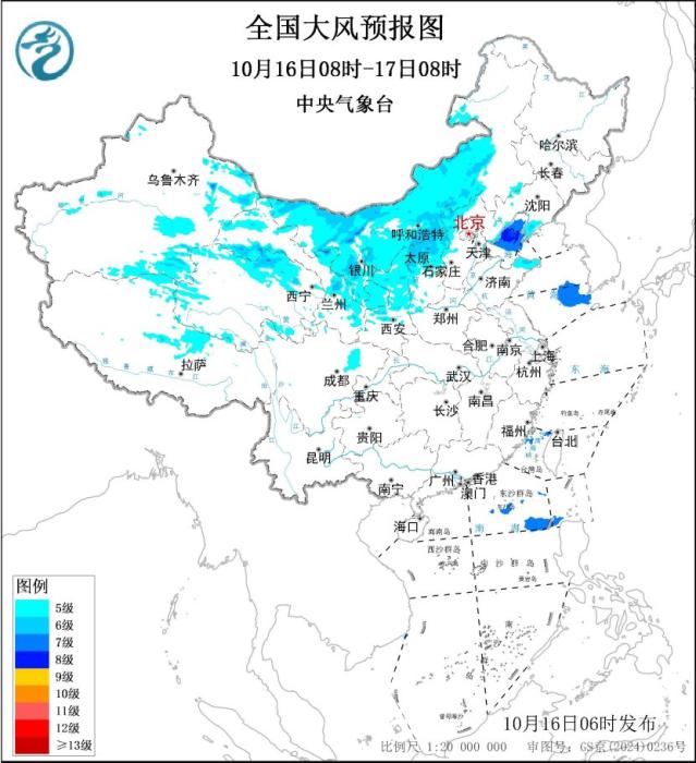 16日至19日,将有较强冷空气自西向东先后影响我国,大部地区平均气温累计下降4~8℃,其中,内蒙古中西部、华北北部、东北地区南部以及湖南、贵州等地部分地区降温10℃以上,局地超过12℃;过程最低气温0℃线将南压到华北北部至陕西北部、甘肃东部一带,大部地区将出现今年下半年以来最低气温。16日08时至17日08时,新疆东部、西藏北部、青海北部和西部、甘肃西北部和东南部、宁夏、内蒙古中西部、陕西中北部、山西中北部、河北西北部、辽宁南部、山东北部等地的部分地区有5~6级、阵风7~9级的大风;渤海、黄海东南部、南海东北部的部分海域将有7~8级、阵风9级的大风。中央气象台10月16日06时继续发布大风蓝色预警。此外,16日至17日,新疆东部和南疆盆地、甘肃西部、内蒙古西部的部分地区有扬沙或浮尘天气。