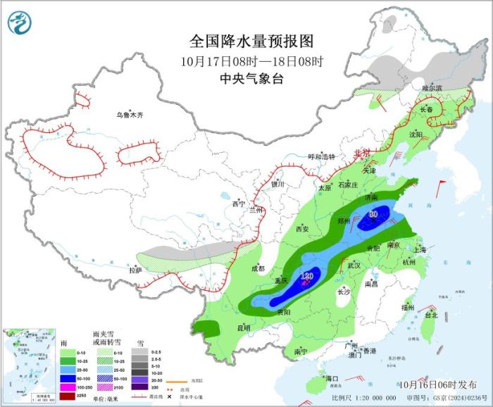 10月17日08时至18日08时,内蒙古东北部、黑龙江中东部、吉林北部、西藏东部、川西高原北部等地部分地区有小雪或雨夹雪。黄淮大部、江淮大部、江汉大部、江南西北部、西南地区东部、云南西南部等地部分地区有中到大雨,其中,山东南部、河南东部、安徽北部、江苏北部、湖北西南部、湖南西北部、重庆东南部、贵州中北部等地部分地区有暴雨或大暴雨(100~120毫米)。内蒙古东南部、辽宁东部、天津中部、山东半岛、河南东部、安徽南部、江苏北部、湖北南部等地部分地区有4~5级风。渤海、渤海海峡、黄海大部等海域有7~8级风、阵风9级。